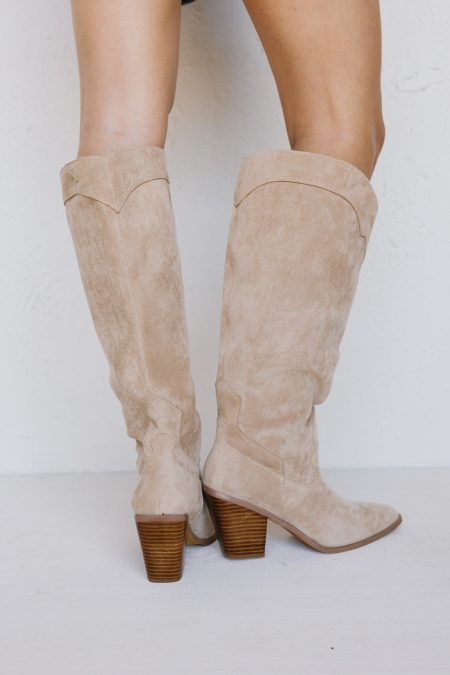 Details Beige knee-high suede western bootsBlock heelPointy toeLoose fitting around calves Fits true to sizeHeel height measures: 3.5 inches