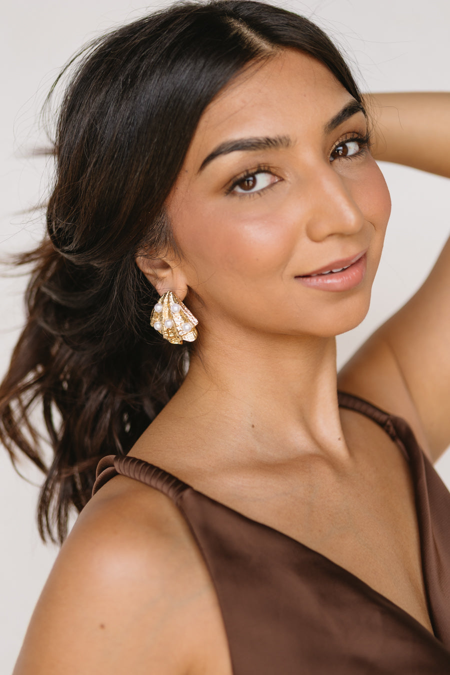 Gold plated shell shaped earrings Post backing Pearl embellishments on front Wavy, textured design Measures 1.5 inches All earrings are considered final sale.